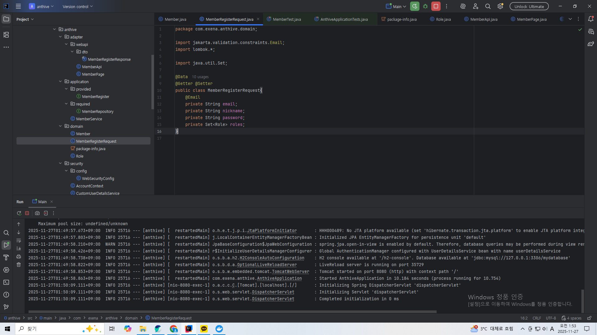 만약 에러가 있다면 첫번째 if문에서 /member/register.html 을 띄운다. 가입 요청 DTO는 @ModelAttribute가 붙어있기에 모델에 자동으로 들어간다. BindingResult도 모델에 같이 들어간다.