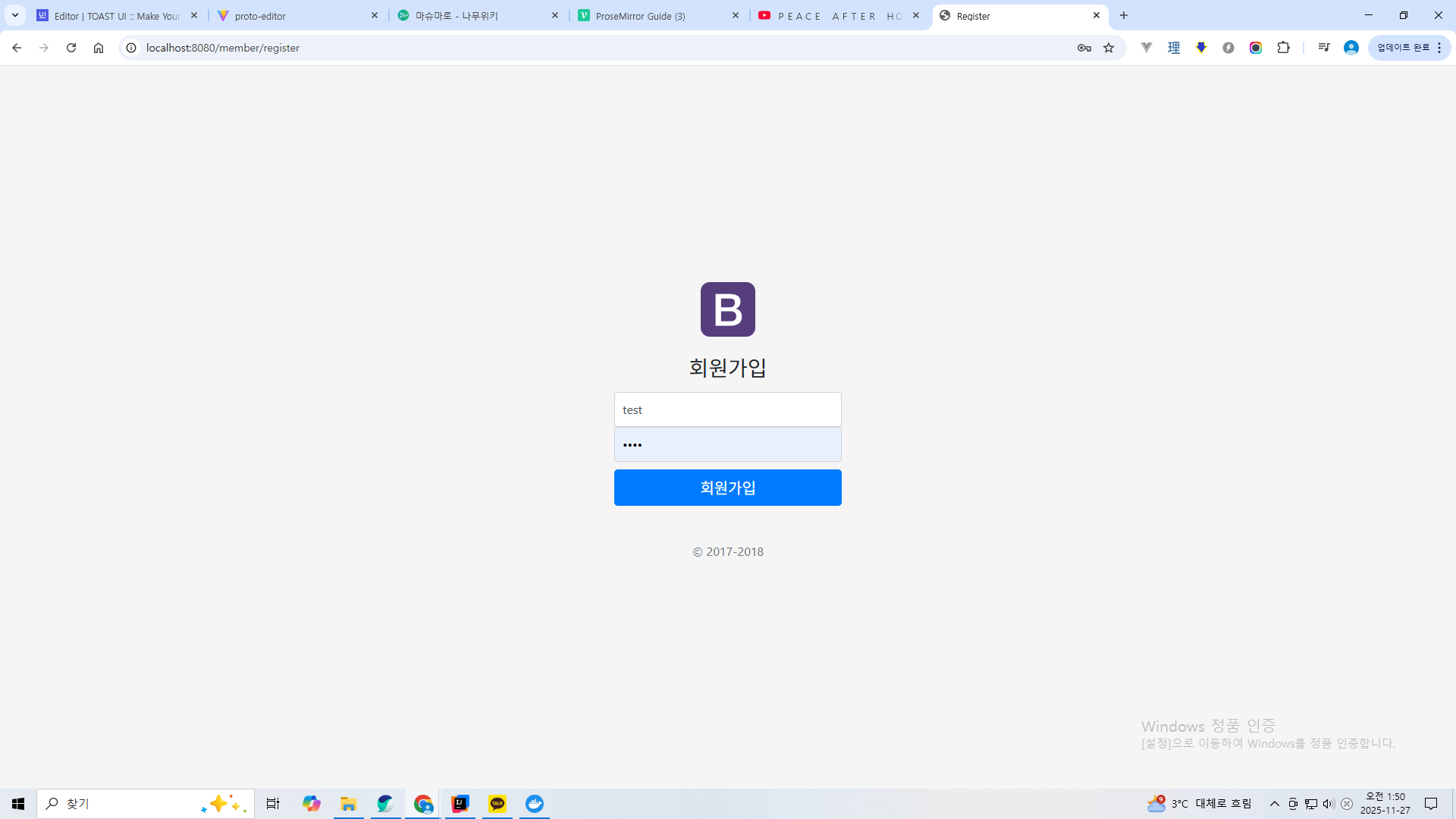 회원가입 화면으로 들어가보자. 위에서 말했다시피 스프링 시큐리티에서 열어놔야 한다.