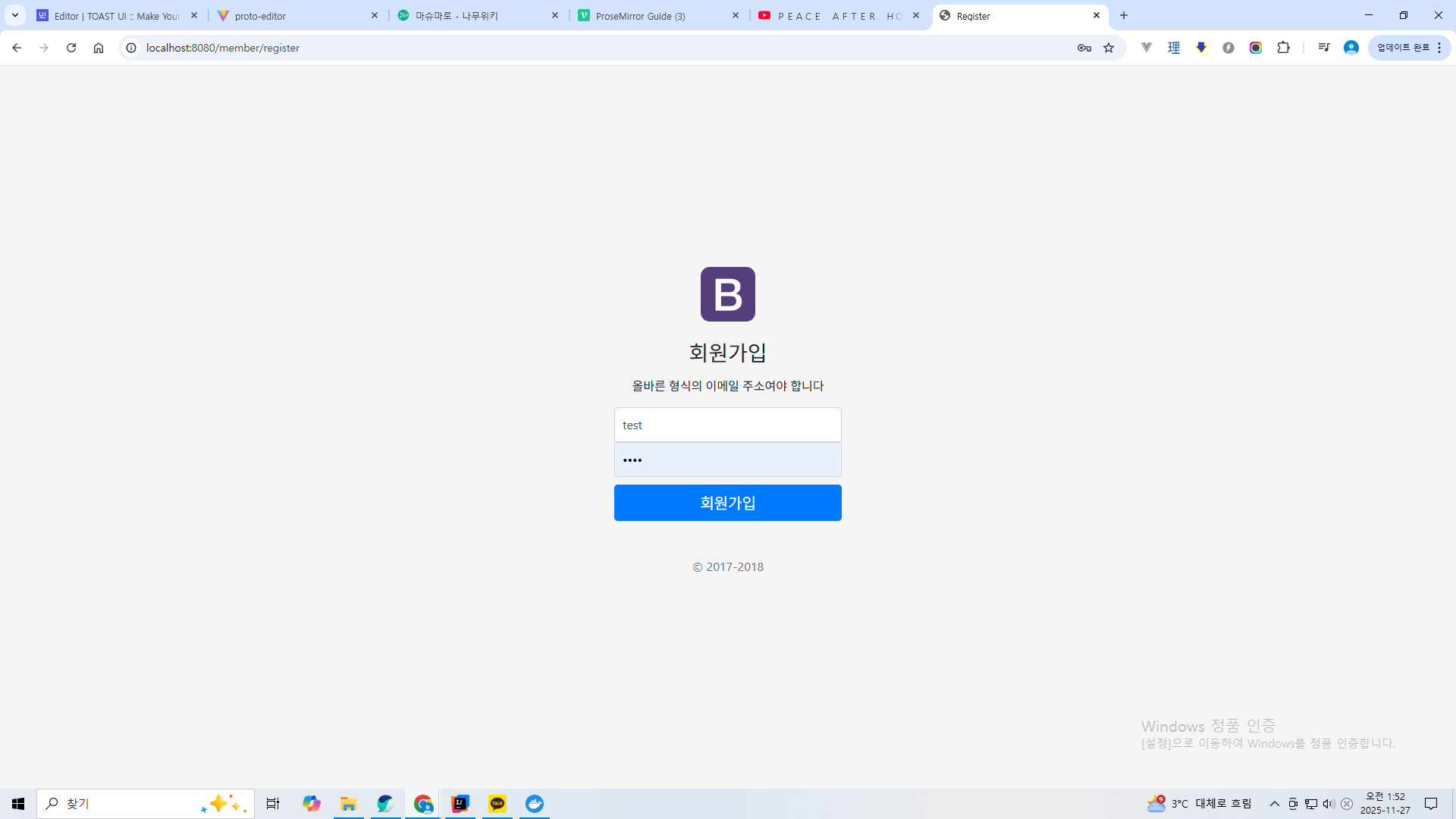 회원가입에 실패하고 메시지가 출력되는 것을 볼 수 있다. 이메일 형식에 맞지 않는다는 듯 하다.