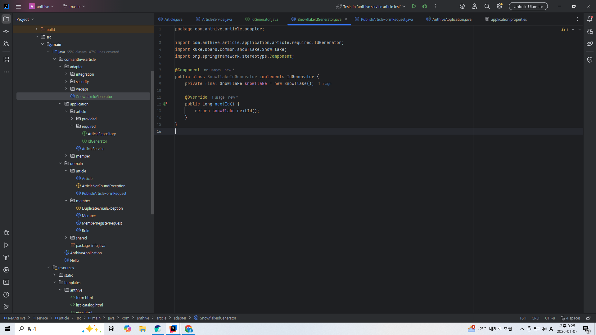 나는 IdGenerator 포트를 통해서 Snowflake를 사용하는 빈을 주입받도록 만들었는데(클린코드 방식)