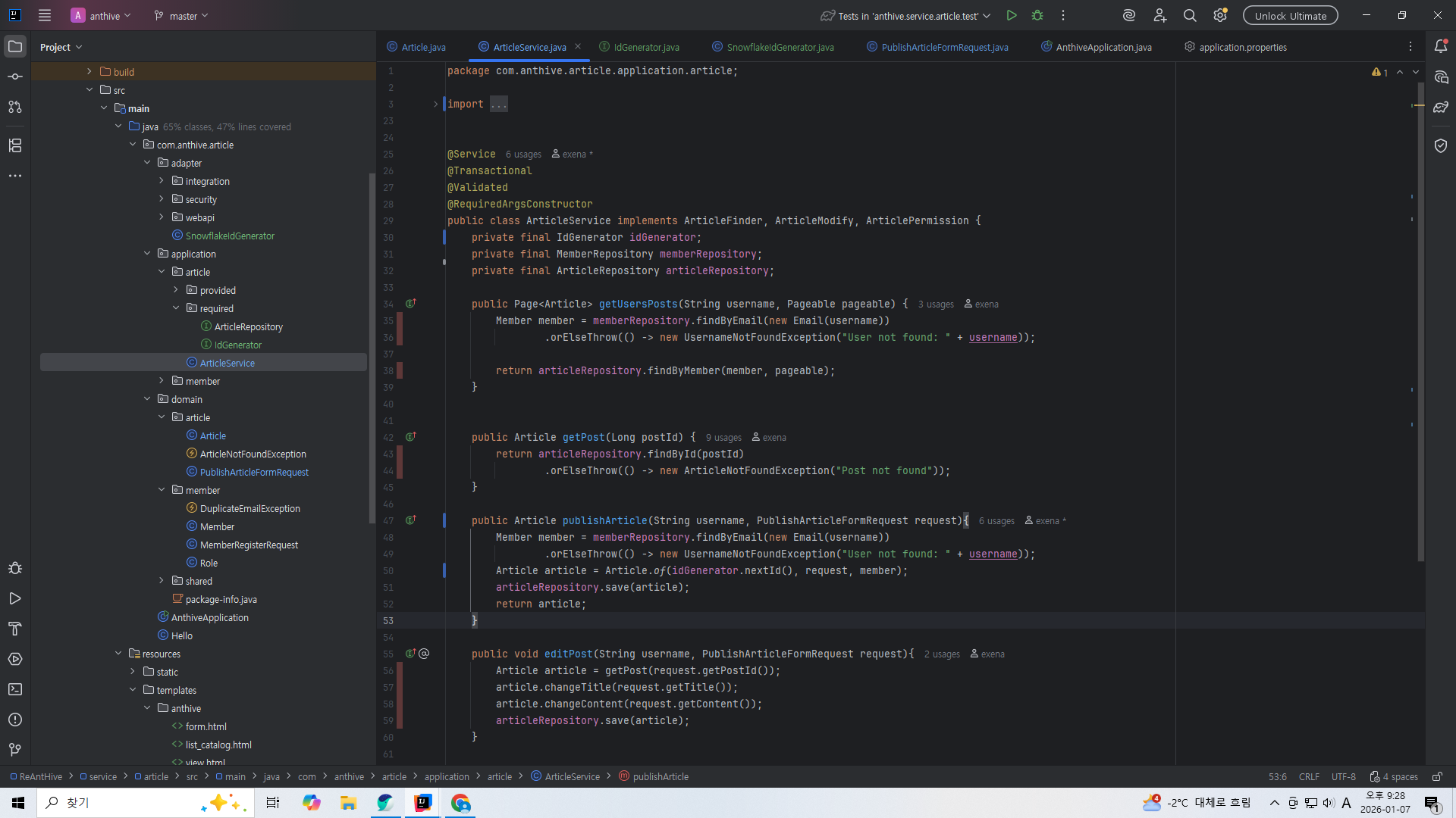 서비스단의 publishArticle 함수에서 id를 만들어서 Article 객체의 생성자에 넣는다.
